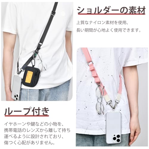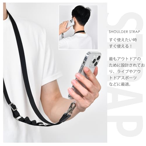 【iphone 紐ストラップ 便利さ】スマートフォンケースにホルダーを挟むだけ!いつでも簡単に取り外せます。ショルダーストラップの幅は2cmでちょうどよく、首からかけたり、肩にかけたり、斜め掛けにしたりと、快適にお使いいただけます。 スマートフォンをバッグから取り出す必要がなく、両手が自由に使えます!コンビニでのスマホ決済、お子様連れのお買い物、ライブ、フェス、アウトドアイベント、スポーツ観戦、運動会、学校行事、仕事中......。 あらゆるシーンで活躍!老若男女問わずお使いいただけます。