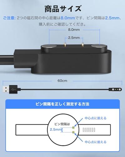 【広範な互換性】この充電器は、磁気充電を利用するほとんどの電子製品に対応しています。スマートウォッチ、スマートグラス、フィットネストラッカーなどのスマートな小型家電に使用できます。2つのピン間の距離が2.5mmのUSB充電ケーブルです。ご購入前スマートウォッチモデルの寸法をよくご確認くださいありがとうございます(測定方法:2つのマグネットチャージポートの中心点間の距離が2.5mm に等しいかどうかを測定してください)。