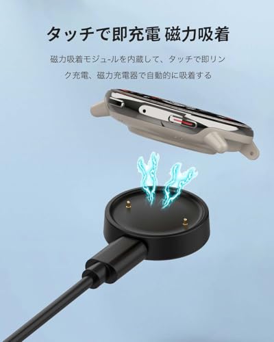 【磁気充電型&使用簡単】付属のUSBコードを電源に差し込み、充電器にウォッチを置くだけで自動的に吸着して充電が始まります。ぴったりに吸着し、角度を自由に置いても充電器の中心から離れず、充電中の落下を防ぐこともできます。振動で滑りずれにくくて、充電できなかった状況を発生しません。