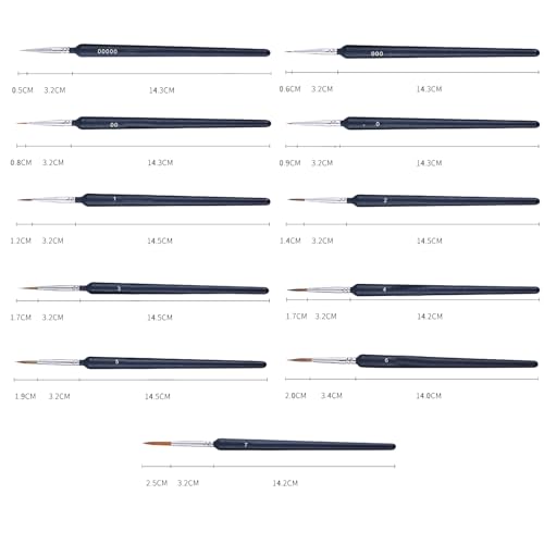 【幅広い用途】 11サイズの絵画用筆をご用意しており、アクリル塗料、油絵、水彩や顔ペイント、模型塗装などに適用し、極細のブラシは繊細な作業にも対応できます。プラモデル塗装、フィギュア塗装などの製作以外にも、絵画、工作などの芸術工作、ネイルやペイントの美容筆、一般的な筆といてもご使用いただけます。