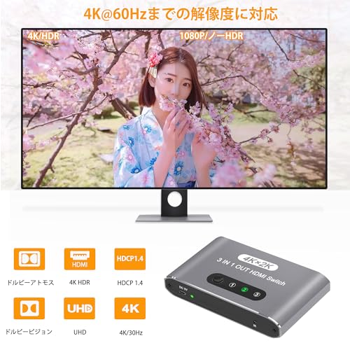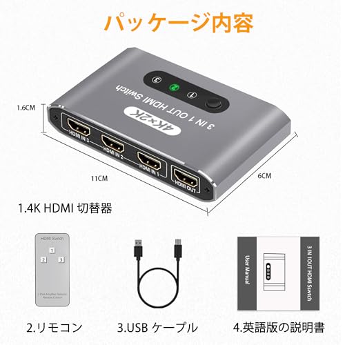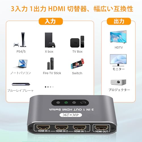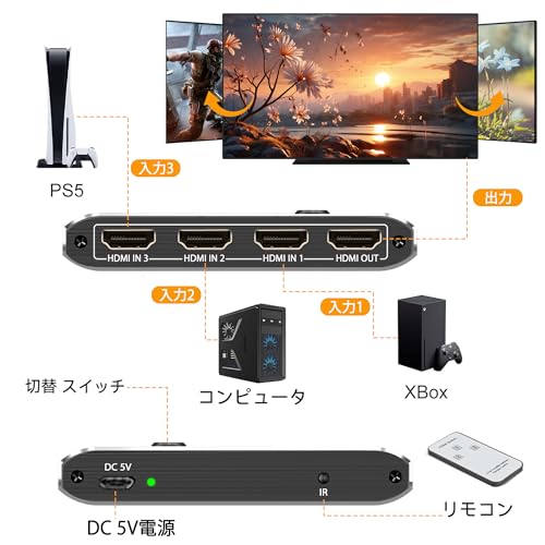 HDMI 切替器 3入力 HDMI スイッチャー ワンタッチ切替 手動 Switcher セレクター アルミ 3入力1出力 切替機 PC PS5 PS4 Nintendo Switch 対応 コントローラ付き