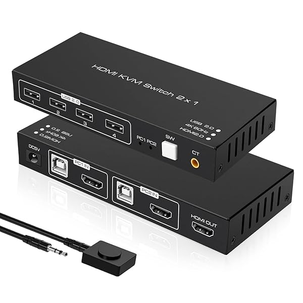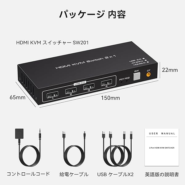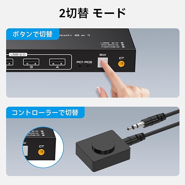 入力装置を2方法で切り替え: 該当HDMI KVM 切替器にはコントローラーを付属しています。切替ボタンのほかにコントローラーで繋ぐ入力装置を変換することができます。コントローラーを引き出しなどに隠して利用できるのはポイントです。ごちゃごちゃになりがちのデスクの上をお洒落になります。