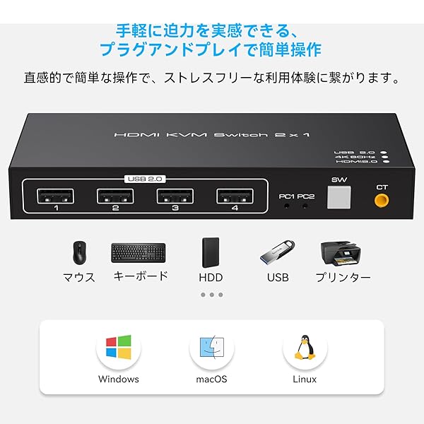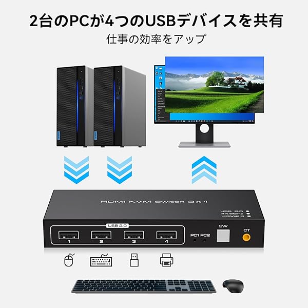 HDMI USB 切替器 4K 60Hz KVM 切替器 2入力1出力 PC 2台 USB 2入力 4出力 KVM スイッチャー セレクター キー ボード マウス プリンター 共有 HDMI 2入力 1出力 ハブ 切替機