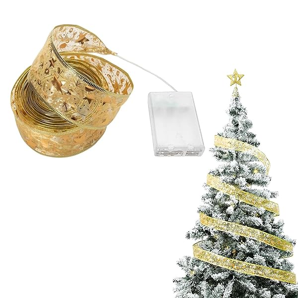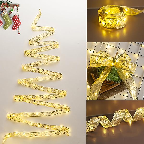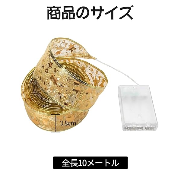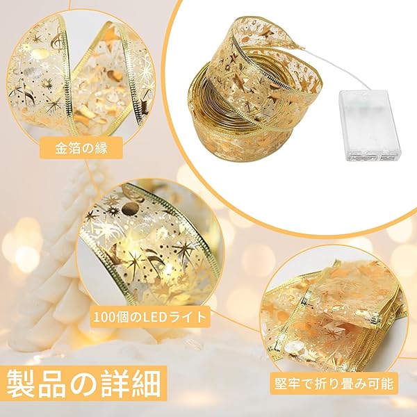 【ゴールドクリスマスリボンライト】:当社のゴールドクリスマスリボンライトは長さ10m、100個のLEDライトで、きらめく素敵なパターンとゴールドのエッジで飾られ、暖かいソフトホワイトの光を放ち、あなたのお祝いの装飾に暖かさと輝きを加えます。 このクリスマスリボンライトは、クリスマスツリーを飾るのに最適で、金色のリボンとライトが絡み合い、豪華なクリスマスの雰囲気を演出します。