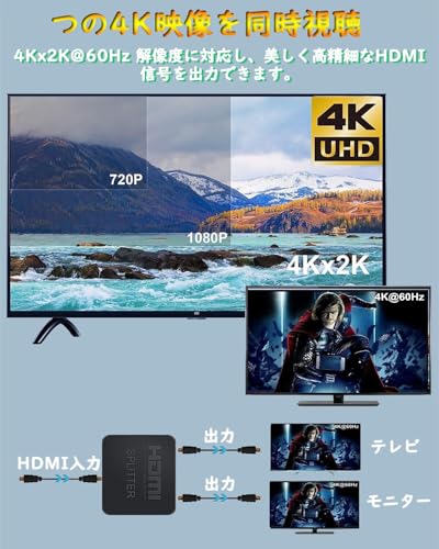 【HDMI分配器 4k】HDMI入力、出力が4K、HDMIケーブルが高品質の場合、両方のモニターがすべて4Kで動作します。HDMI スプリッター 1入力2出力は、4k@60Hz をサポートし、2k/1080p と下位互換性があります。遅延なし、画質や音質の低下なし。豪華なビデオとオーディオを友人や家族と共有できます。
