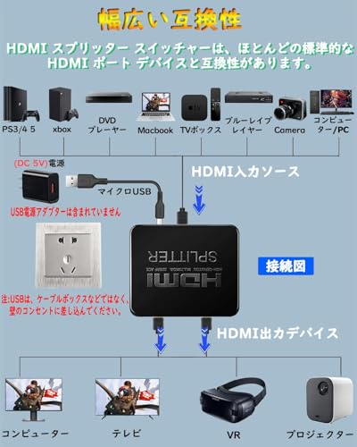 【入/出力機器の互換性】HDMI分配器 拡張モード対応 サポート入力: コンピューター、パソコン/PC、MacBook、メディアボックス、PS5、pro、PS4、Switch、XBox、Fire TV、ROKU、Blu-Ray DVD プレーヤーなど。
