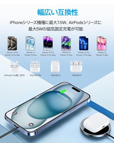 ケースつけのままでも:ケース無しのiPhone 16/15/14/13/12シリーズのスマホとAirPods 4/Pro(第二世代)/3にくっつくと充電できるし、マグセーブ対応の磁気式カバーを付けても、このまま置いて充電可能で