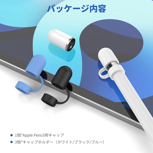 セット内容: Apple Pencilキャップ本体 1個、キャップホルダー 3個, カラー:ホワイト/ブラック/ブルー, 材質:キャップ本体:ABS キャップホルダー: シリコン