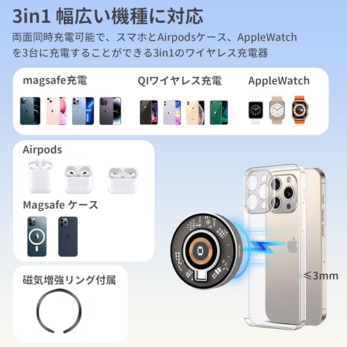 MagSafe マグネット式 マグセーフ充電器 3 in 1 ワイヤレス充電器 Apple Watch 充電器 Qi認証 急速充電 i-Phone / Apple Watch / Airpodsに対応 15W出力 TypeC端子 Apple Watch Ultra / 8 / 7 / 6 / 5 / 4 / 3+ Airpods 2 / 3 / Pro i-Phone15 / 14 / 13 / 12...