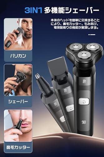 【3in1電気シェーバー 3D回転式360°】 メンズシェーバー は髭剃り、バリカン、鼻毛カッターの3つの機能を1台に凝縮した多機能モデルです。シェーバーヘッドでひげを剃り、バリカンヘッドで長いひげや体毛を整え、鼻毛カッターヘッドで鼻毛を除去できます。360°回転ヘッドの設計により、顔の凹凸に密着し、快適な深剃りや早剃りが可能です。また、肌との摩擦を軽減し、より滑らかな剃り心地を実現します。