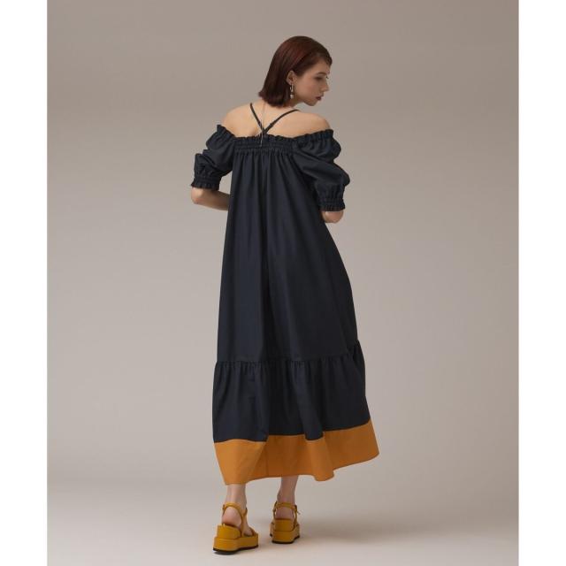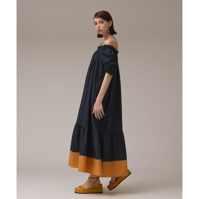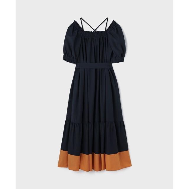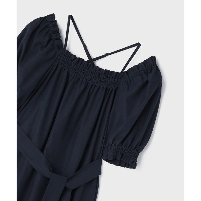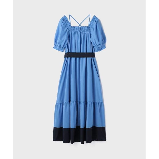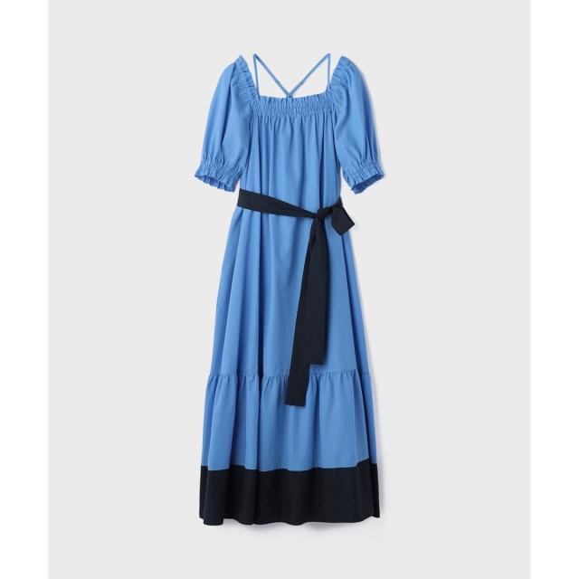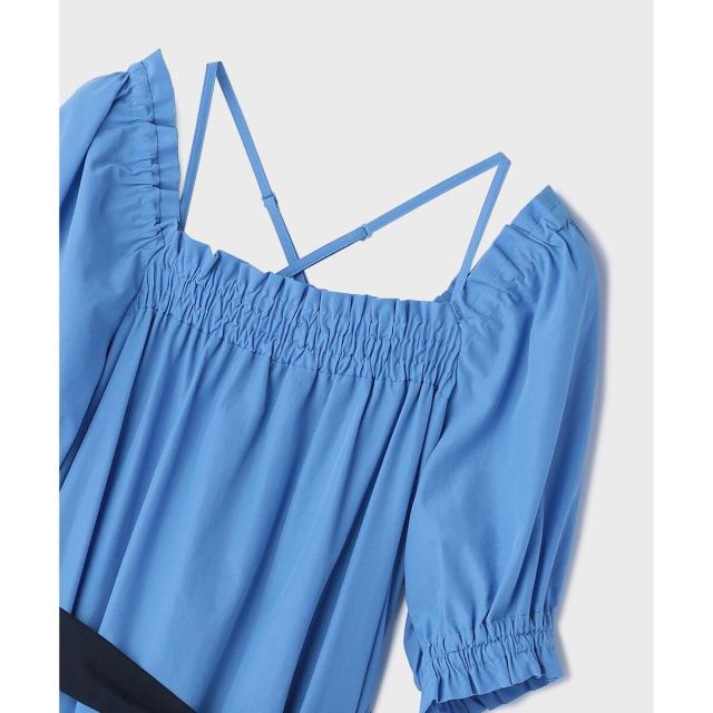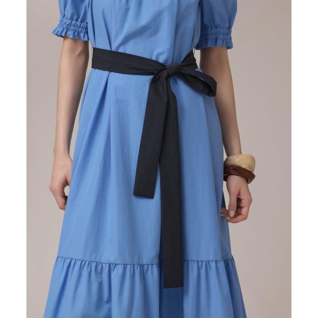 ギャザーテクニックをたっぷりと入れた上品に着映える大人のサマードレス。やや肉厚で張り感のあるタイプライター素材を使用し、用尺をたっぷりと取った贅沢な蹴回しが華やかな存在感を放ちます。裾とリボンベルトを配色カラーで仕上げて、モードなアクセントとして効かせました。ゆったりとした開放感のあるテント型で、汗ばむ季節でもストレスのない着心地。ウエストに付属のリボンを添えれば、自然とメリハリの効いたシルエットをお楽しみいただけます。ふっくらとしたパフスリーブも可憐なアクセントに。衿ぐりにゴムが入っている為、オフショルダーとしても使用でき、肩紐も取っていただけお好み応じてアレンジも自在です。