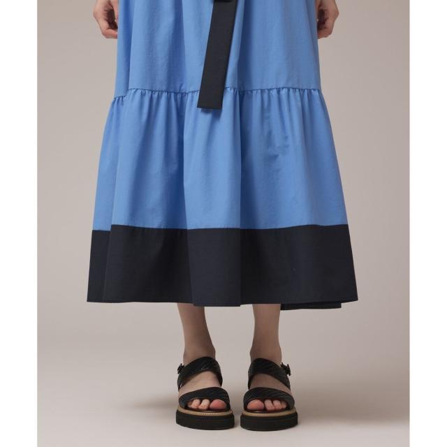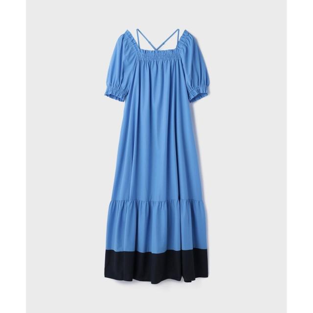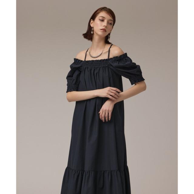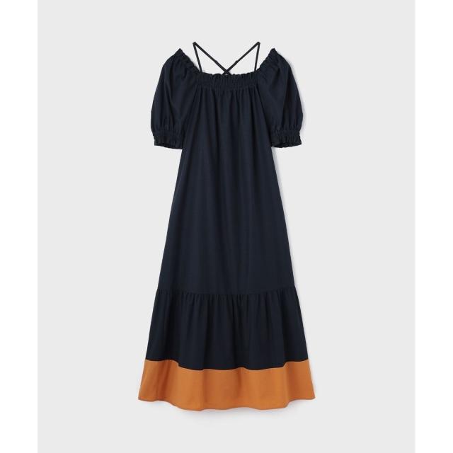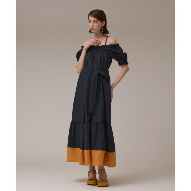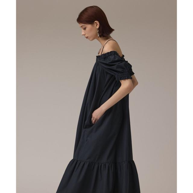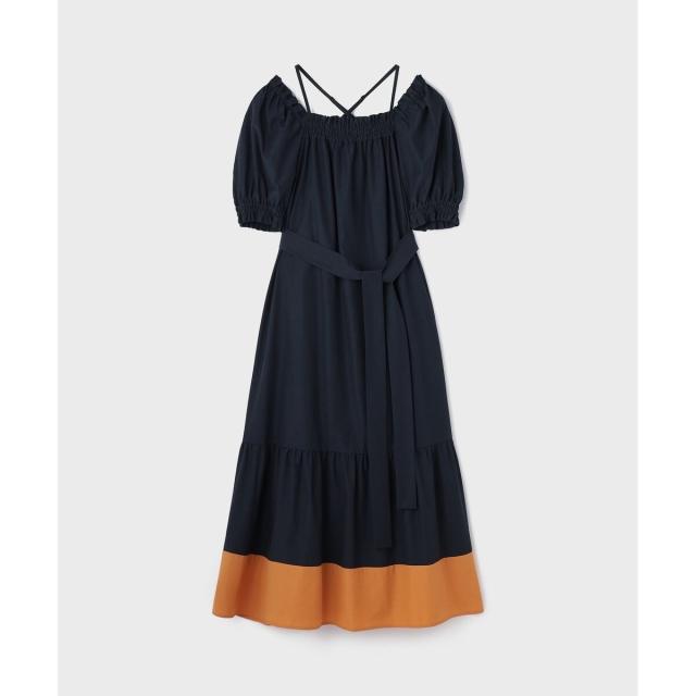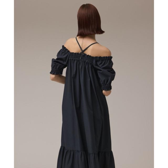 ギャザーテクニックをたっぷりと入れた上品に着映える大人のサマードレス。やや肉厚で張り感のあるタイプライター素材を使用し、用尺をたっぷりと取った贅沢な蹴回しが華やかな存在感を放ちます。裾とリボンベルトを配色カラーで仕上げて、モードなアクセントとして効かせました。ゆったりとした開放感のあるテント型で、汗ばむ季節でもストレスのない着心地。ウエストに付属のリボンを添えれば、自然とメリハリの効いたシルエットをお楽しみいただけます。ふっくらとしたパフスリーブも可憐なアクセントに。衿ぐりにゴムが入っている為、オフショルダーとしても使用でき、肩紐も取っていただけお好み応じてアレンジも自在です。