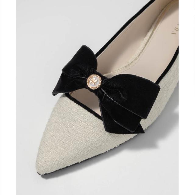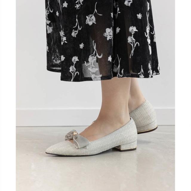 オリジナルのパールボタンがクラシカルな雰囲気のフラットパンプス。