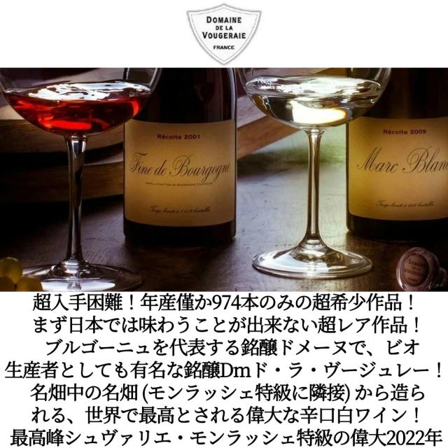 超入手困難!年産僅か974本のみの超希少作品! まず日本では味わうことが出来ない超レア作品! ブルゴーニュを代表する銘醸ドメーヌで、ビオ生産者としても有名な銘醸Dmド・ラ・ヴージュレー! 名畑中の名畑 (モンラッシェ特級に隣接) から造ら れる、世界で最高とされる偉大な辛口白ワイン!最高峰シュヴァリエ・モンラッシェ特級の偉大2022年