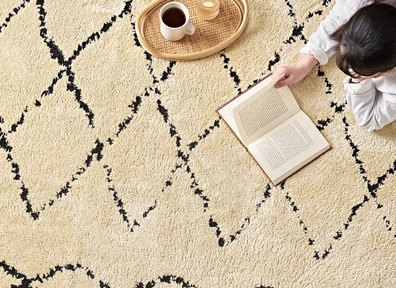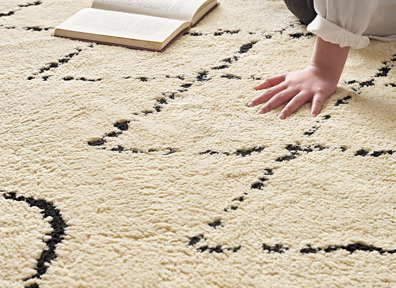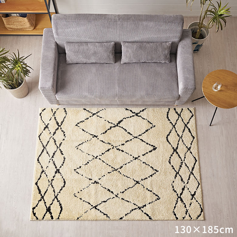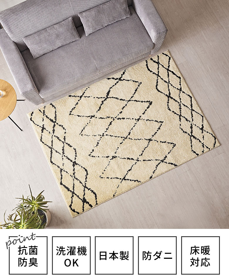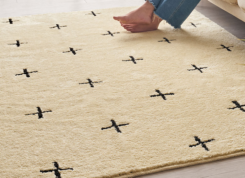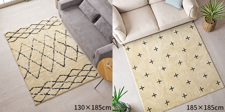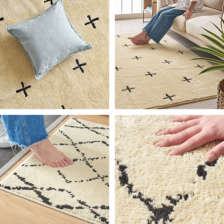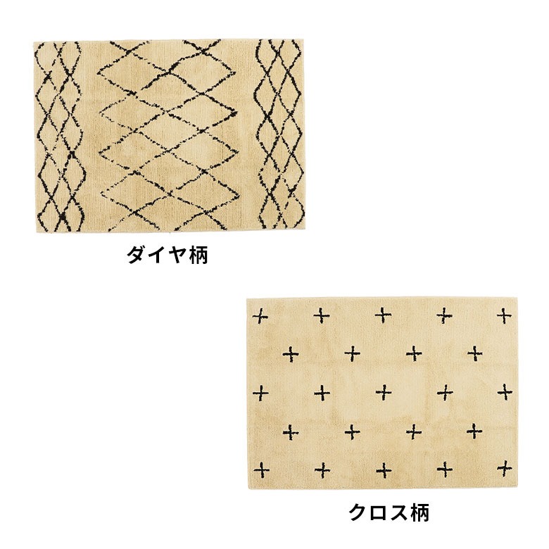 これだけの機能性を持ちながら、しかもおしゃれ!フリーハンドで描かれたような模様で、ベニオワレンラグ風ダイヤ柄とクロス柄の2パターンからお選びいただけます。ベーシックカラーでインテリアに馴染みやすいので、デザインラグ初心者の方にもおすすめです。