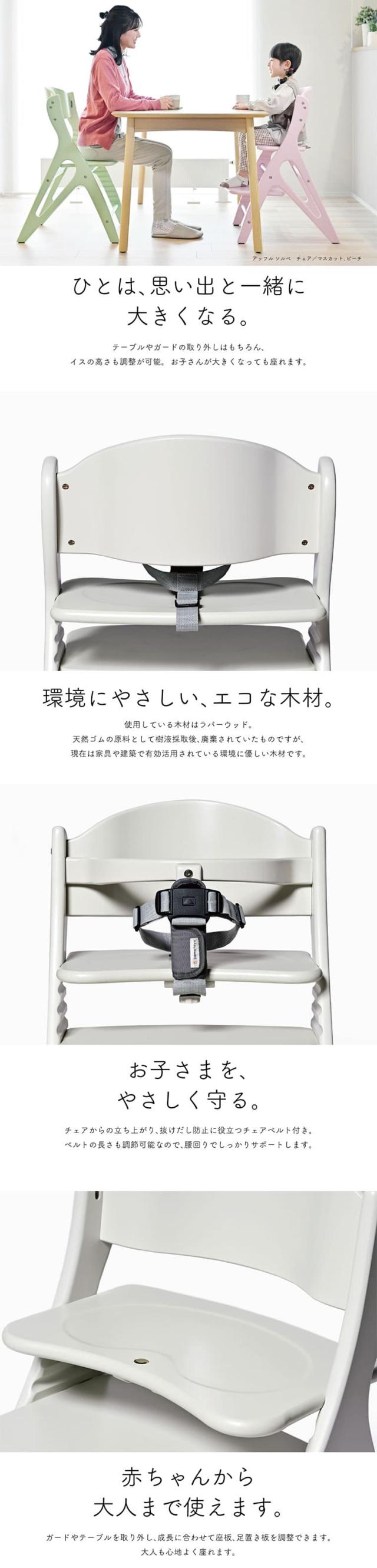 テーブルやガードの取り外しはもちろん、イスの高さも調整可能。成長に合わせて高さ調整できベビー、キッズ、大人も座れるチェア。"