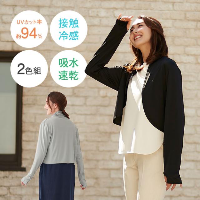 軽く羽織れるUVカットボレロ 2色組 接触冷感 吸水速乾 ひんやり 涼しい 冷感素材 紫外線対策 日焼け防止 カーディガン ボレロ レディース 夏用 長袖 親指穴付き アームカバー代用 冷房対策 携帯しやすい 洗える 旅行 散歩 自転車 121975