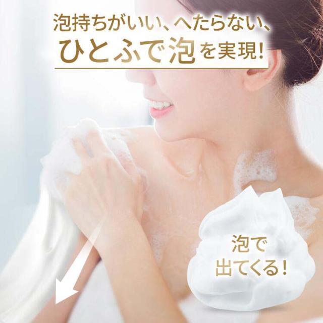 ●へたらない、ひとふで泡*3を!ひとふで泡とは柔らかいのにへたりにくく、のびる性質の泡で、少ない量でも気持ちよく全身にのびます。