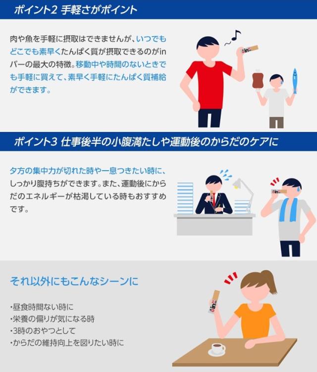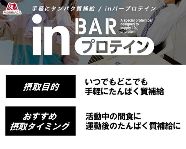 ●商品紹介 (いつでもどこでもタンパク質チャージ) 「inバー プロテイン」シリーズはおいしく手軽におやつ感覚でタンパク質を補給できる、バータイプの栄養補助食品です。