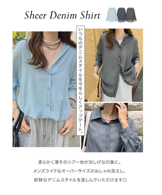 春新作 シアーデニムシャツ C7603 入荷済 レディース シアーデニム シャツ シアーシャツ ブラウス 羽織り 軽アウター 紫外線対策 UV対策 メンズ ユニセックス 春夏秋 透け感 シアー感 デニムシャツ レイヤード日除け 重ね着 衿 ボタン 襟 男女