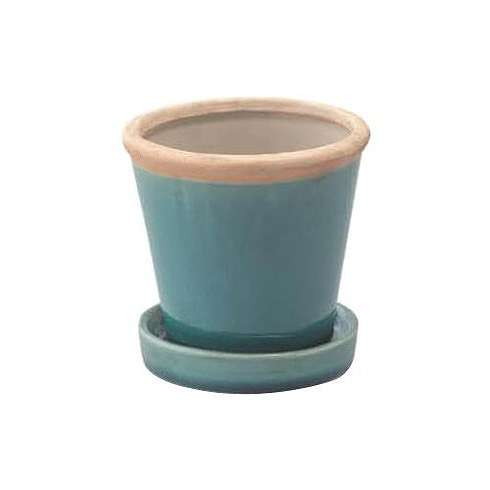 ターコイズカラーの植木鉢が植物などを引き立ててくれます。