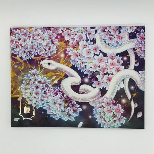 《春宵の巳》華やかな桜と白蛇を描いたものです。白蛇は、幸運の象徴として知られる動物。皆さまに沢山の幸運がやってきますように。