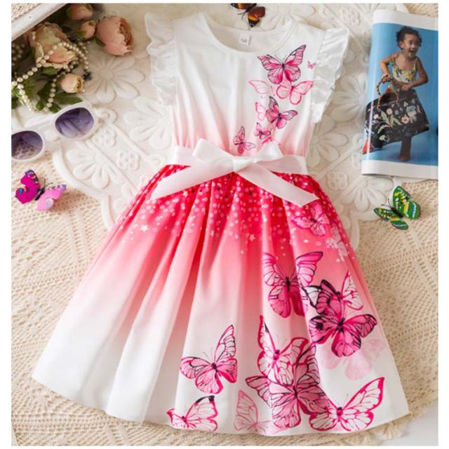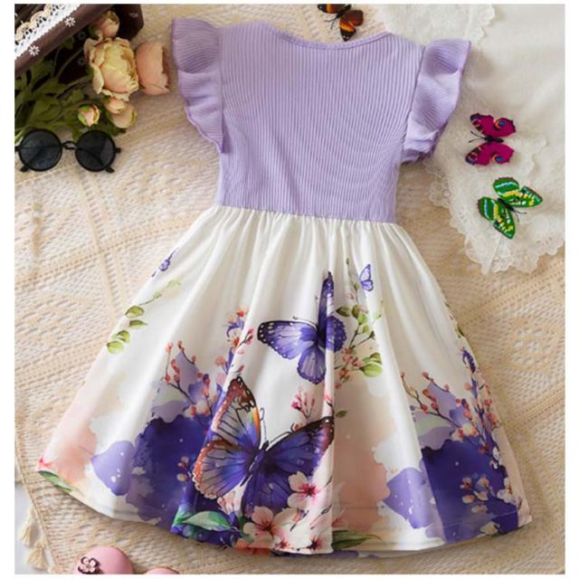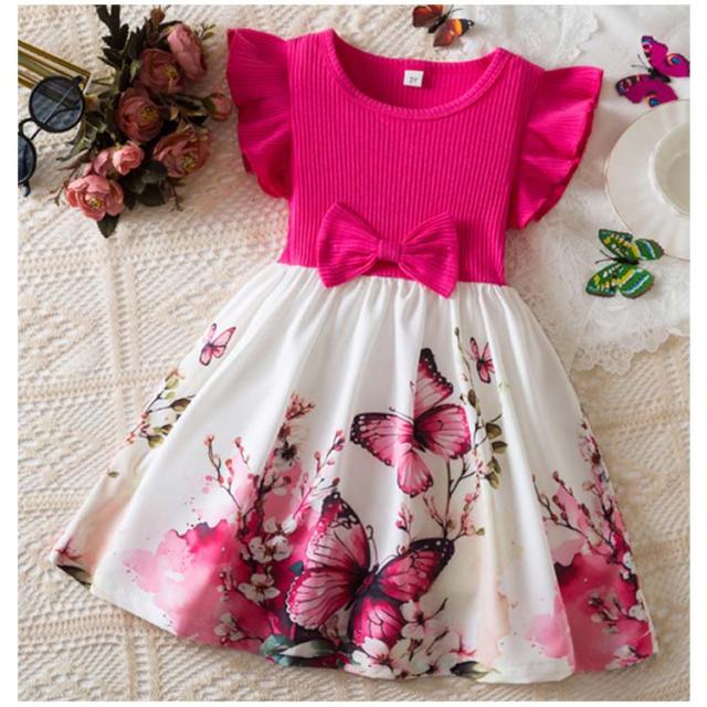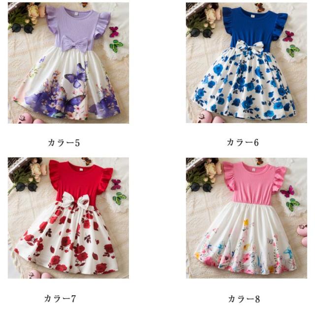 おしゃれ フリル袖 女の子 子供 フリル袖 ベビー ドレス キッズ お出かけ 姉妹 お揃い かわいい リボン 姫系 子供服 ワンピース 花柄 蝶柄 プリント 結婚式 お誕生日会
