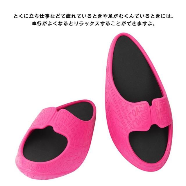 | かかとからつま先にかけて底が曲線を描いているため、不安定な状態で体勢をキープ! 底がぐらぐらするため、ふくらはぎに自然と力が入り、筋肉を刺激してくれる。 不安定な状態をキープすることで体幹力もアップし、美脚効果が期待できる! 滑りにくい素材で安全性も◎軽いので履くだけで簡単にシェイプアップができる。 EVA樹脂を使用したアウトソールは耐久性が高いため、へたりにくく長く愛用できるでしょう。 姿勢が良くない方には、これを履くだけで姿勢改善にサポートしてくれるので、継続することで姿勢の改善のほか、足細も目指せる! 一日15分履いて歩くだけで、筋肉を鍛えると脂肪が燃焼し、足裏刺激で結構アップ疲れを緩和させます。 とくに立ち仕事などで疲れているときや足がむくんでいるときには、血行がよくなるとリラックスすることができますよ。 | |