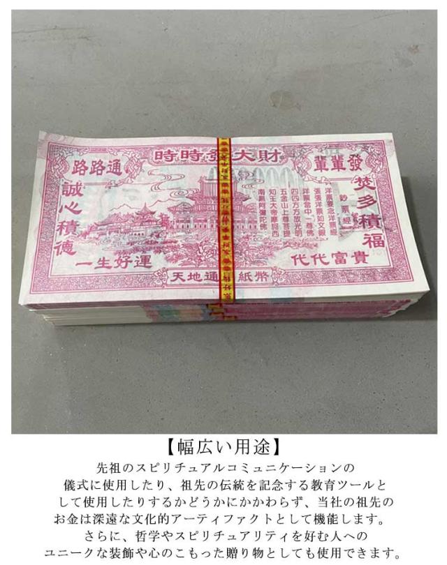 | 【先祖のお金を燃やす】コンセプトは、亡くなった家族が死後の世界でこの「お金」を使って必要なものを手に入れることができるということでした。あの世でのより良い生活ができるというビジョンが望まれました。 【文化的意義】祖先のお金、地獄のお金、スピリットマネー、天国のメモ、ジョスペーパーとしても知られています。 亡くなった愛する人への敬意と記憶の証であると信じられています。祖先のお金は、順風満帆、健康、富、繁栄を願う伝統文化を定めています。 【多用途な儀式用】- 祖先のお金は、葬式、先祖の死の記念日、清明祭、お盆、空腹の幽霊祭り、物理的な世界と精神的な領域をつなぐものとして使用できます。 愛、尊敬、記憶の証となり、世俗的な祝福を先祖と共有したいという願望を表現します。 【幅広い用途】- 先祖のスピリチュアルコミュニケーションの儀式に使用したり、祖先の伝統を記念する教育ツールとして使用したりするかどうかにかかわらず、当社の祖先のお金は深遠な文化的アーティファクトとして機能します。 さらに、哲学やスピリチュアリティを好む人へのユニークな装飾や心のこもった贈り物としても使用できます。 | |