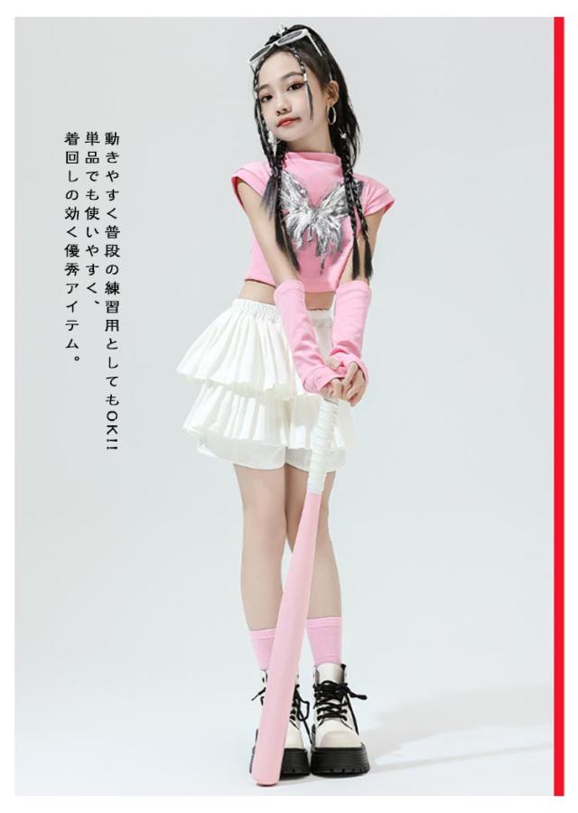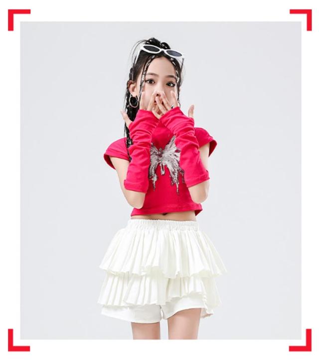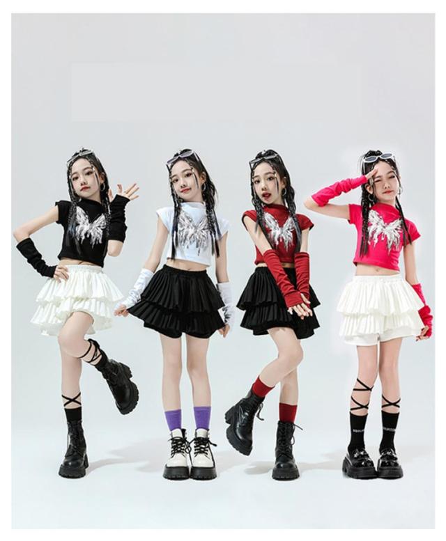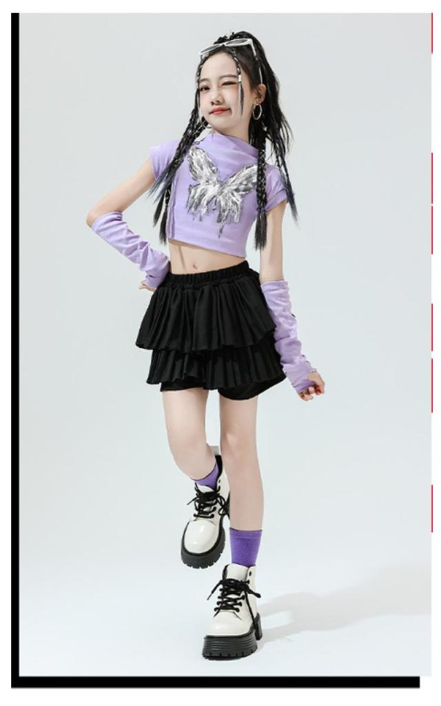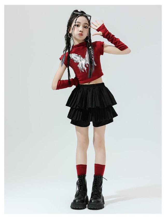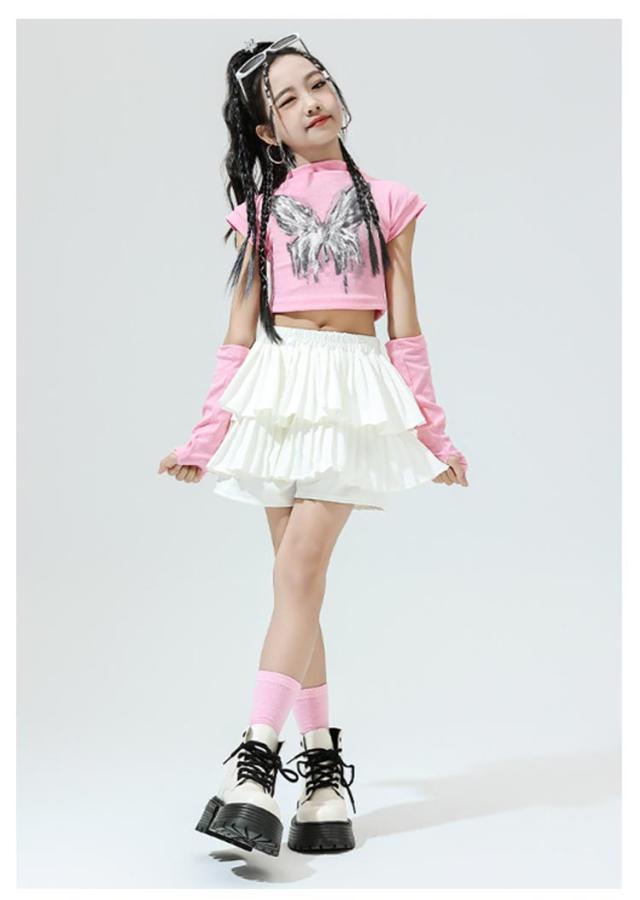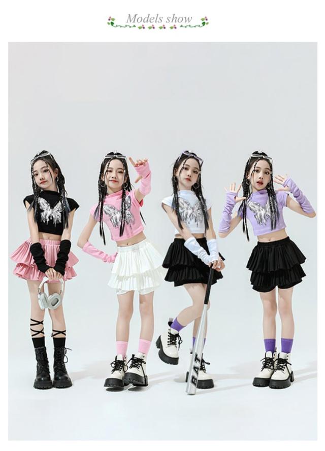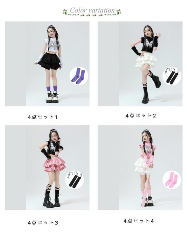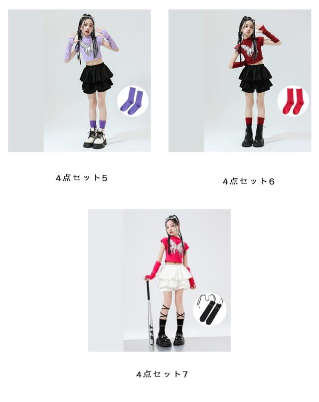 K-pop 【4点セット】 おしゃれ 白 黒 粉 紫 女の子 蝶柄 セットアップ キッズダンス チアガール ドラムショー 公演服 Tシャツ+カフス+スカート+靴下 赤 演出服 舞台 団体服 【4点セット】 ガールズ ダンスウェア ファッション