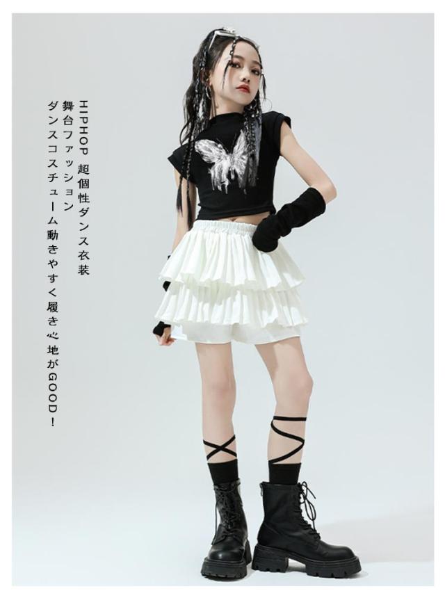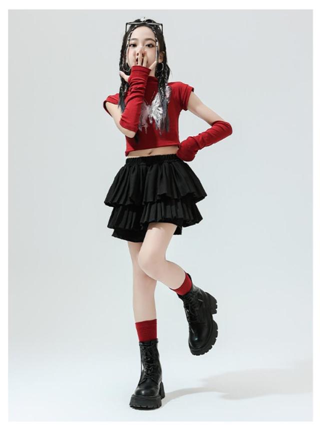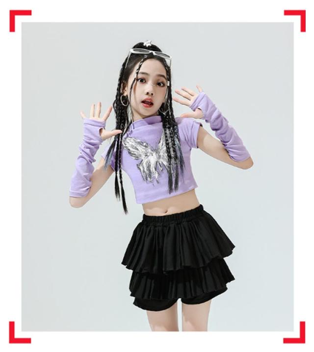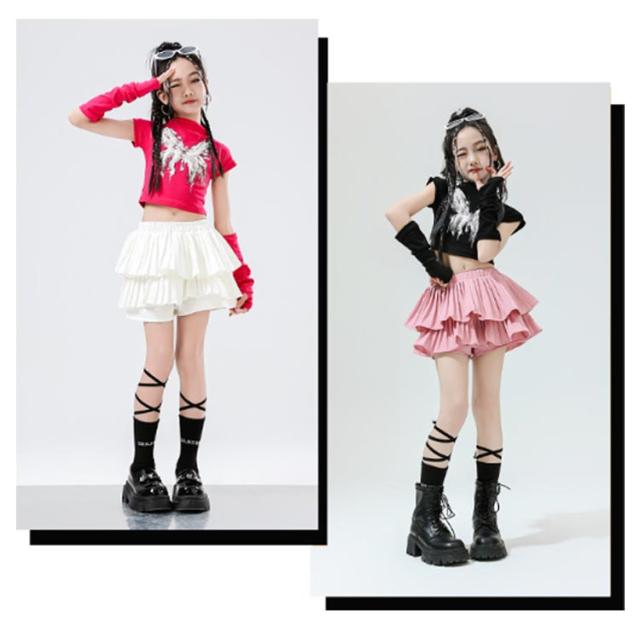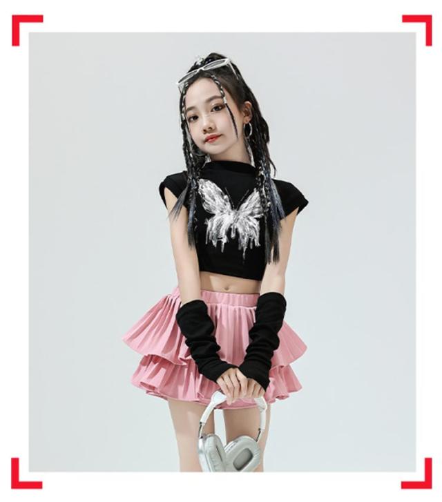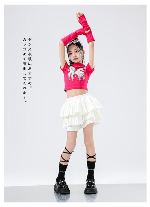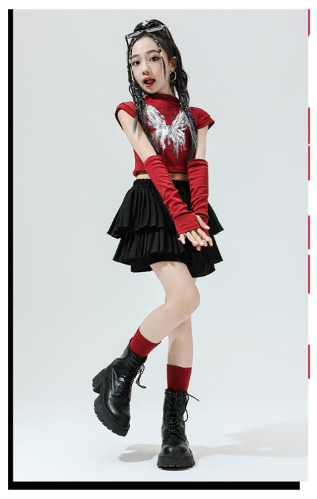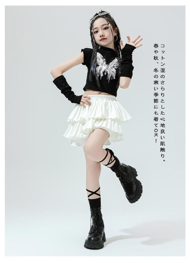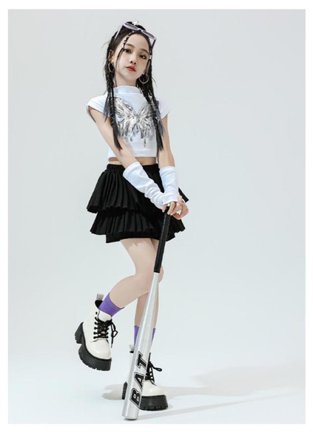 K-pop 【4点セット】 おしゃれ 白 黒 粉 紫 女の子 蝶柄 セットアップ キッズダンス チアガール ドラムショー 公演服 Tシャツ+カフス+スカート+靴下 赤 演出服 舞台 団体服 【4点セット】 ガールズ ダンスウェア ファッション