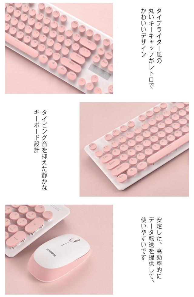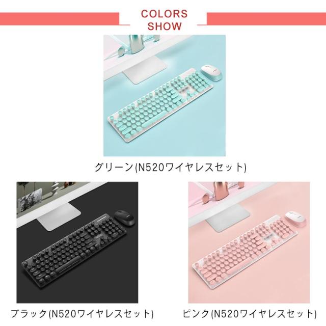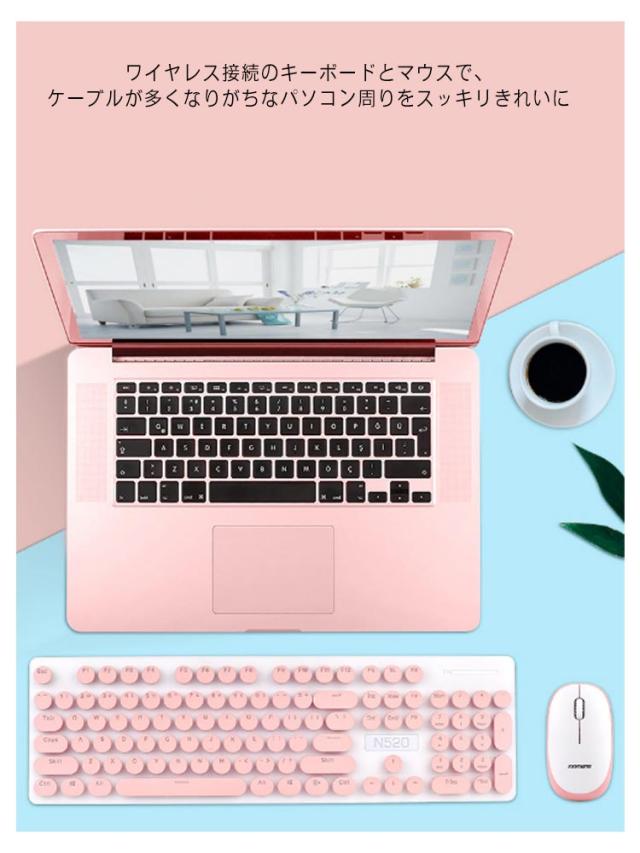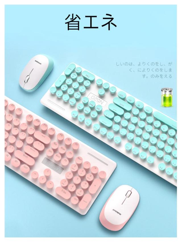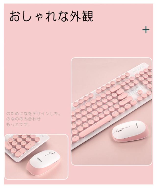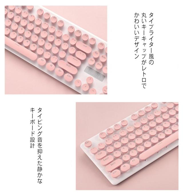 | レトロでかわいいワイヤレスキーボード&マウスの2点セット。 ワイヤレス接続のキーボードとマウスで、ケーブルが多くなりがちなパソコン周りをスッキリきれいに。 線がごちゃごちゃしないので作業もはかどり効率もアップ。 プライベートな作業や在宅ワークなど様々なシーンに最適。 タイプライター風の丸いキーキャップがレトロでかわいいデザイン。 タイピング音を抑えた静かなキーボード設計。 音がきになる時間帯や場所でも気兼ねなくお使い頂けます。 | |