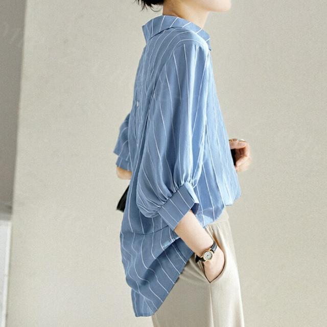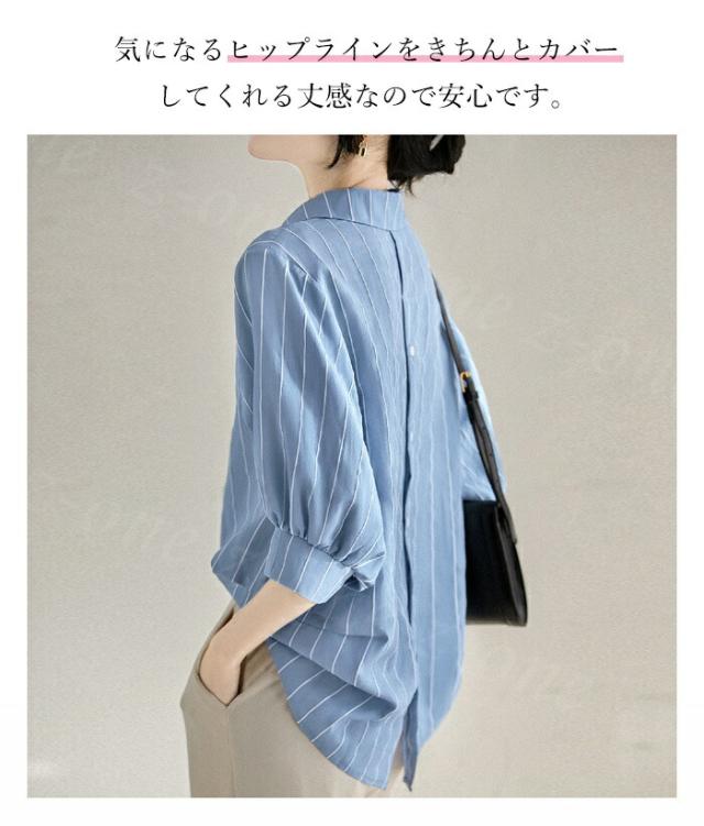 ストライプロングシャツ 七分袖 襟付き 後開き シャツブラウス ストライプ ロング 前後差 春新作 レディース 春夏 トップス カジュアル シンプル 薄手 サマーシャツ 可愛い UVカット オシャレ