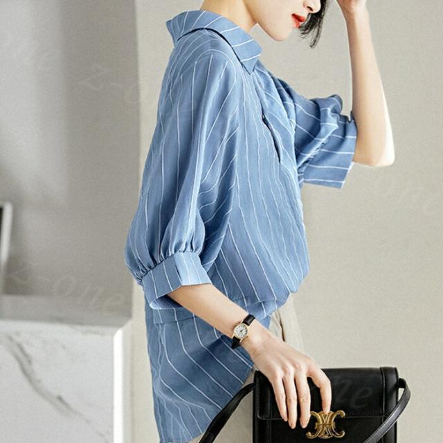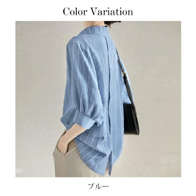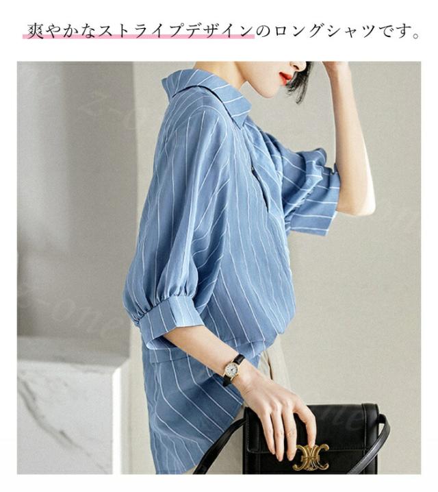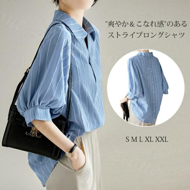 ストライプロングシャツ 七分袖 襟付き トップス シャツ ブラウス 超目玉商品 S M L XL XXL