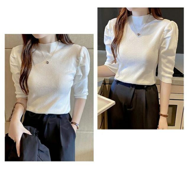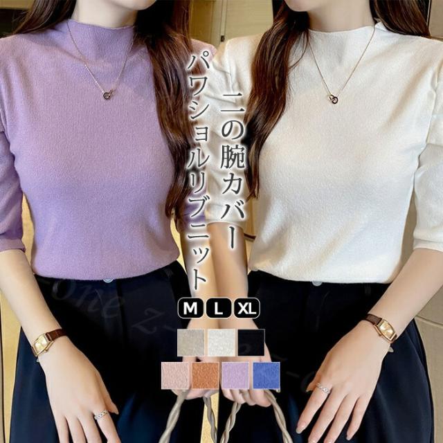 30%OFF サマーニット パワショル ニット トップス レディース リブニット 半袖 五分袖 タートルネック ハイネック パフスリーブ 無地 オフィスカジュアル 上品 二の腕 カバー スク きれいめ