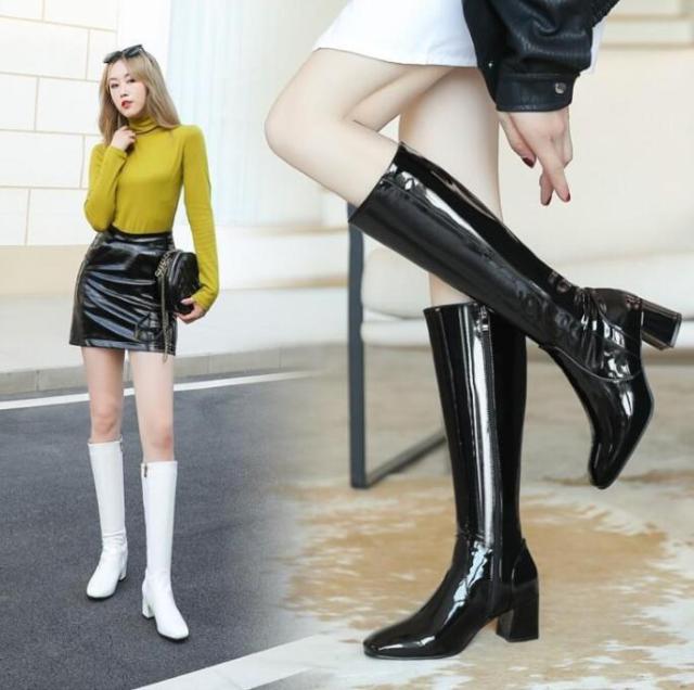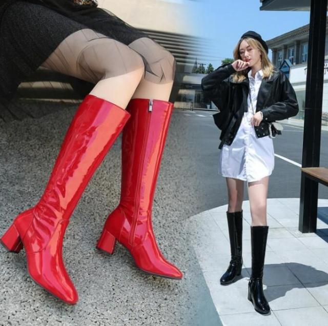レディースブーツロングブーツエナメル5.5センチハイヒール光沢ロング丈秋冬春秋ダンスブーツ大きいサイズ27.5cmまで小さいサイズ ロングブーツ ダンス舞台