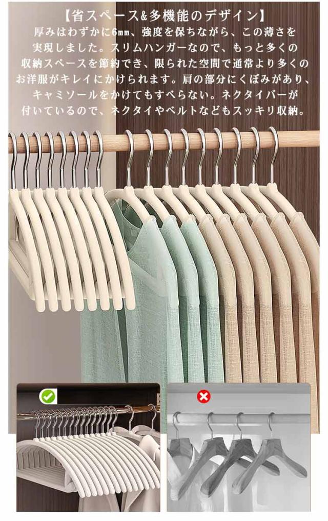 | 特殊加工の起毛素材でで衣類をしっかりキャッチ!【50本セット】 【すべらない】表面の起毛加工素材と両肩部分のきりこみが衣類の落下を防ぎます。 【肩に跡がつかない】人間工学に基づいて、型崩れにくい曲線を設計しました。人間の肩に合わせた曲線により、衣類が型くずれしません。型崩れしやすいセ—ター等にも対応しております。 【省スペース&多機能のデザイン】厚みはわずかに6mm、強度を保ちながら、この薄さを実現しました。スリムハンガーなので、もっと多くの収納スペースを節約でき、限られた空間で通常より多くのお洋服がキレイにかけられます。肩の部分にくぼみがあり、キャミソールをかけてもすべらない。ネクタイバーが付いているので、ネクタイやベルトなどもスッキリ収納。 | |