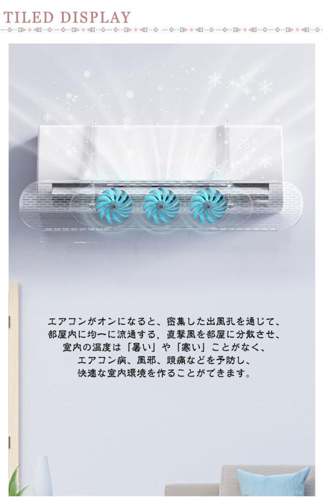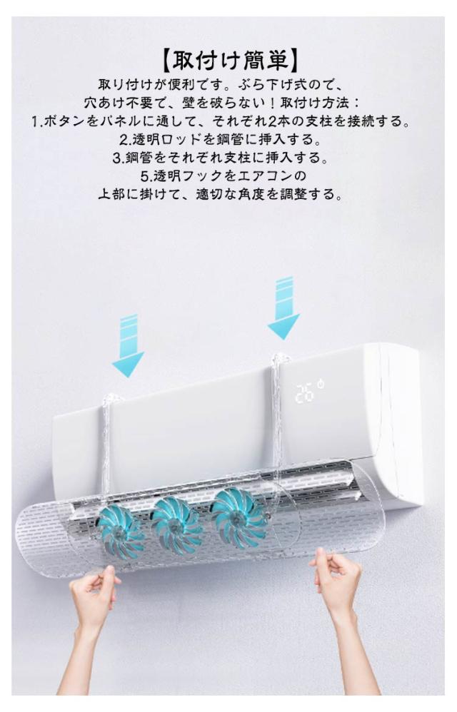 | エアコンの直撃風を防ぐ!3つの風車付きでエアコンの風を循環! エアコンがオンになると、密集した出風孔を通じて、部屋内に均一に流通する,直撃風を部屋に分散させ、室内の温度は「暑い」や「寒い」ことがなく、エアコン病、風邪、頭痛などを予防し、快適な室内環境を作ることができます。 【取付け簡単】取り付けが便利です。ぶら下げ式ので、穴あけ不要で、壁を破らない!取付け方法:1.ボタンをパネルに通して、それぞれ2本の支柱を接続する。2.透明ロッドを鋼管に挿入する。3.鋼管をそれぞれ支柱に挿入する。5.透明フックをエアコンの上部に掛けて、適切な角度を調整する。 【多機種対応&夏も冬も快適に過ごせる】さまざまなニーズに対応でき、調節しやすく、使いやすい。冷暖房兼用で、ほとんどの家庭用・共用エアコン機種に対応。エアコンの風が直接当たることによる冷えや乾燥を防ぐ役割を担っています。風除けで分散された風が部屋全体に広がり、室温が均一に整いやすいのが特徴です。「ここは寒い」「ここは暑い」等の温度ムラを軽減します。 【角度調節対応】エアコンの直撃風を解消する!健康な生活を与えて、風邪を引く可能性がおおきく低くなる!ルーバーだけでなく、アームによる上下移動と合わせて細かく調整可能です。家のどこにいても冬も夏も快適! 健康に過ごせて省エネ効果も期待できるエアコン風よけカバです。 | |