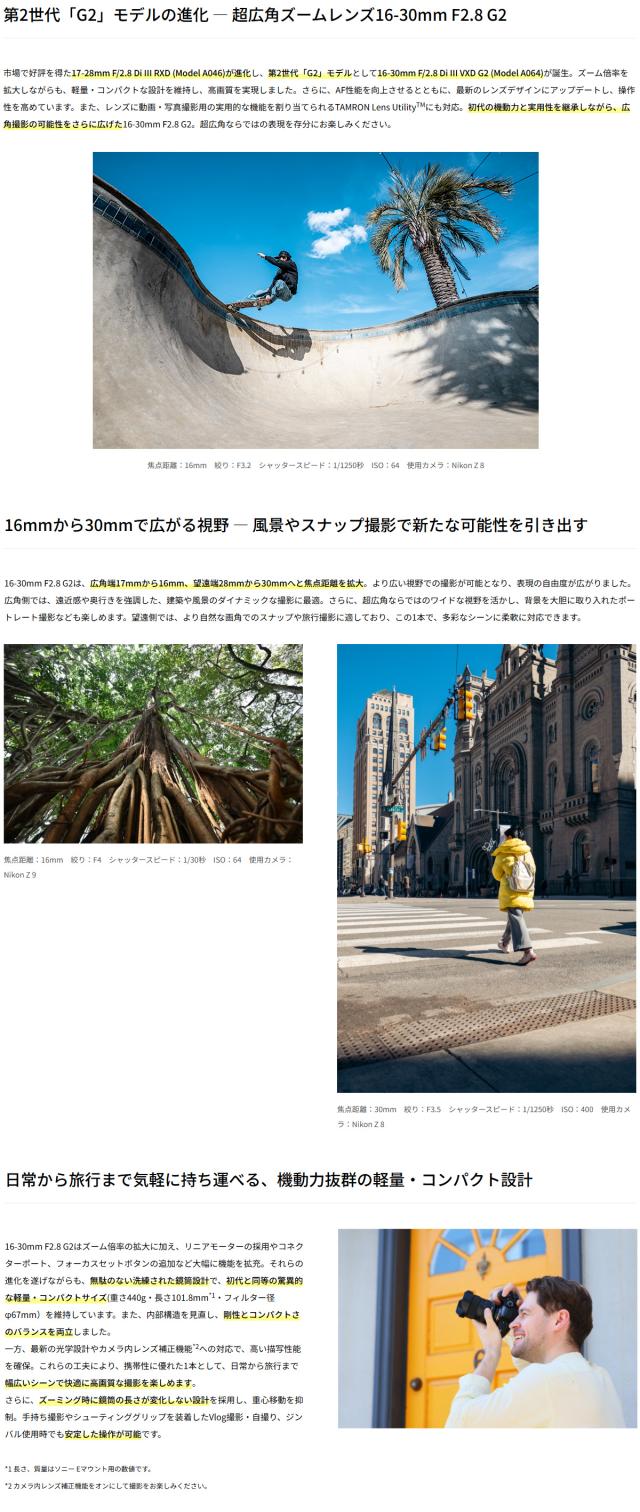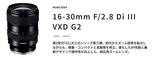 | A064S 16-30mm F/2.8 Di III VXD G2 ソニー Eマウント用 超広角ズームレンズ フルサイズ スペック情報 | |