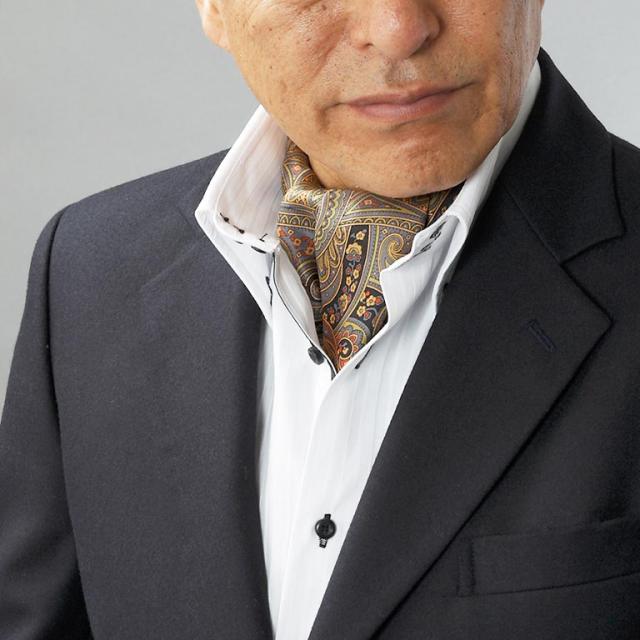 シルク100%の上質感あふれるアスコットタイ。ワンタッチで着脱可。首元を華やかにカバーし、顔色を明るい印象に。男女問わず使えます。
