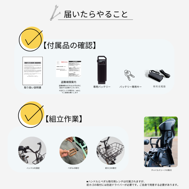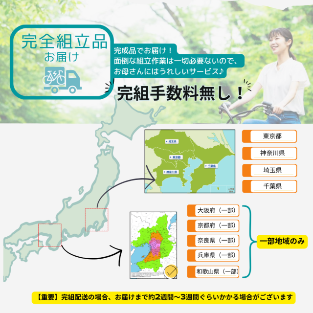 【配送について】 ●お届けについて 本商品は7分組立状態にてお届けさせて頂きます。 「前カゴ」「ペダル」「ハンドル」「チャイルドシート」の取付や固定の作業が必要となりますので、予めご了承ください。 大型配送品の為、注文確定日からお届けまで平均1週間〜2週間前後お時間いただいております。 ★完全組立配送も可能(限定地域) 東京都・埼玉県・神奈川県・千葉県 大阪府(一部地域) 京都府(一部地域) 奈良県(一部地域 兵庫県(一部地域) 京都府(一部地域) 和歌山県(一部地域) 上記一部地域は完全組立配送が可能です。 注文確定日からお届けまで平均2週間〜3週間前後お時間いただいております。 なお、対象地域ではない場合は、自動で「7分組立配送」に変更されますので、予めご了承ください。 |
