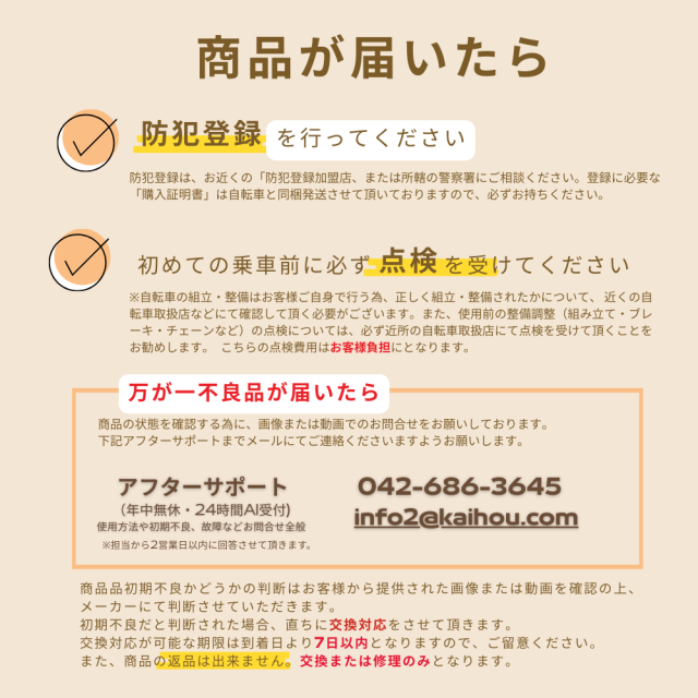【初期不良・返品について】 出荷完了後の返品はお受付出来かねますので、予めご了承ください。 初期不良を含め全てメーカーサポートによる保証対応となります。 ■カイホウジャパンサポートセンター 電話番号:042-686-3645 【自転車の初期整備・点検について】 本製品を受け取ったら、お客様自身で下記の組立作業を行う必要がございますので、必ずご確認ください。 「前カゴ」「ペダル」「ハンドル」の取付や固定の作業とチャイルドシードの取付作業(セット購入した場合) 【自転車取扱店などにて整備士による整備点検を受けてください】 メーカー直送品の場合、自転車の組立・整備はお客様ご自身で行う為、正しく組立・整備されたかについて、 近くの自転車取扱店などにて確認して頂く必要がございます。 大変お手数をお掛け致しますが、使用前の整備調整(組み立て・ブレーキ・チェーンなど)の点検については、 下記防犯登録手続きの際に、必ず近所の自転車取扱店にて点検を受けて頂くことをお勧めします。 ※必要な組立道具は同梱させて頂いておりますので、取扱説明書をご確認上、作業を行ってください。 ※空気入れは必要に応じてお客様ご自身でお願いいたします。 【防犯登録手続きは当店にて承れます!】 ※当店でご加入いただく場合、東京都警察でのご登録になりまして 防犯登録シールの都道府県名は所在地の板橋区になります。 【その他】 メーカー直送品の為、代引き決済が出来かねます。 |