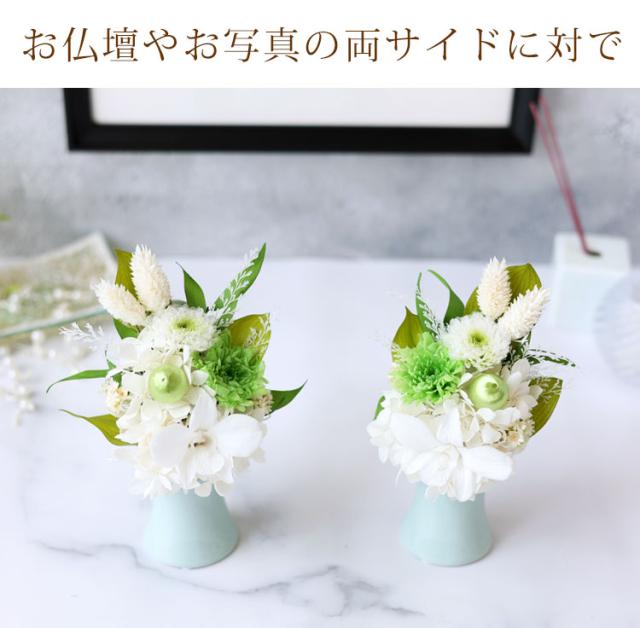 お仏壇やお写真に対でお供えできる枯れないお花のアレンジ。和風・洋風どちらのインテリアにも素敵に飾っていただけます。