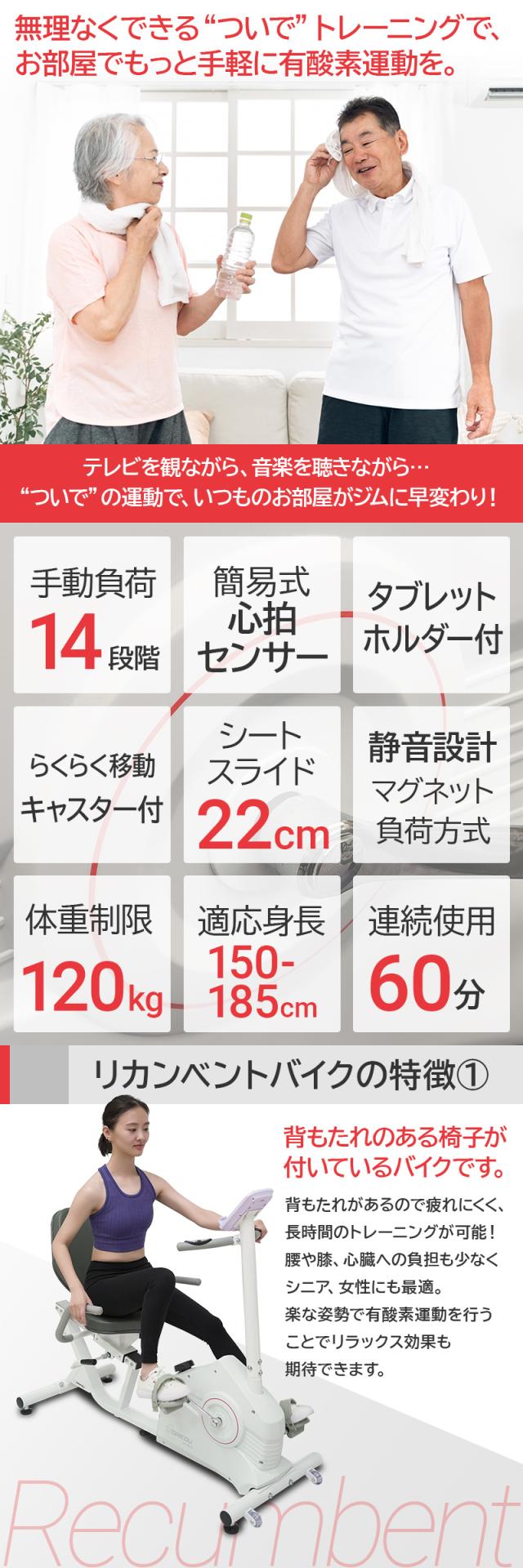 リカンベントバイクのエントリーモデル。背もたれ付きのトレーニングバイク。乗り降りしやすい低床モデル。マンションでも安心、静音タイプ。