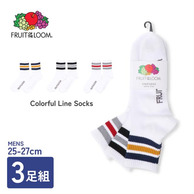 クォーター丈ソックス 3Pラインソックス パイル編みクッション タオル地ソックス 快適履き心地 オールシーズンソックス ギフト プレゼント メンズ レディース 男女兼用 FRUIT OF THE LOOM フルーツオブザルーム ベトナム製 ポリエステル混紡 カラフルソックス 普段使い 靴下セット カジュアルソックス スポーツソックス