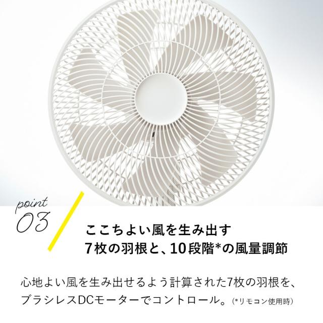 心地よい風を生み出せるように計算された7枚の羽根を、回転数が細かく設定できるブラシレスDCモーターでコントロール。細かく10段階*に風量調節ができます。(*リモコン使用時。本体の操作パネルでは4段階調節)