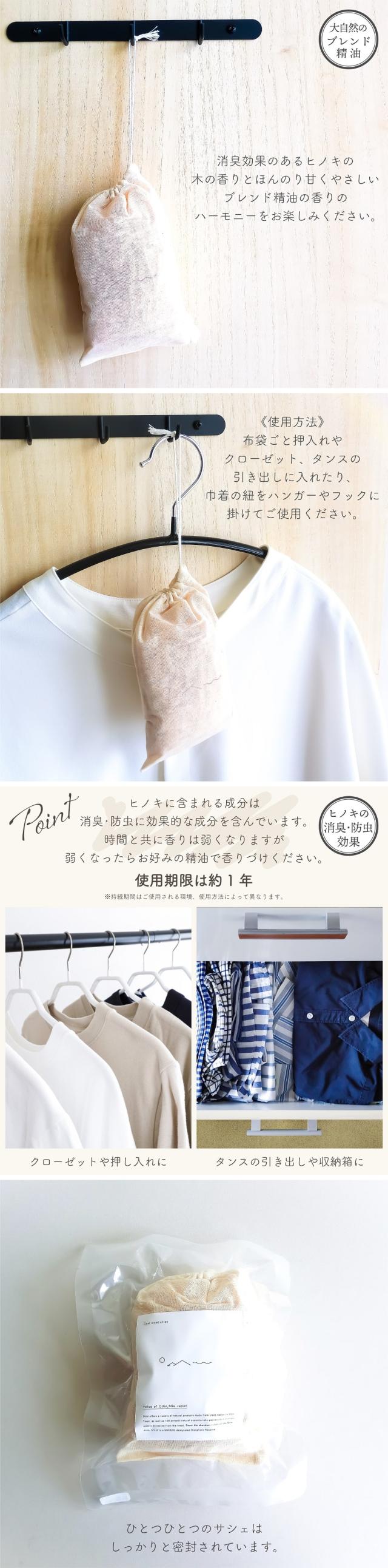ヒノキに含まれる成分は消臭・防虫に効果的な成分を含んでいます、時間と共に香りは弱くなりますが、弱くなったらお好みの精油で香り付けください。使用期限は1年程となっております。袋ごと押し入れやクローゼット、タンスの引き出しに入れたり、巾着の紐をハンガーやフックに掛けてご使用ください。