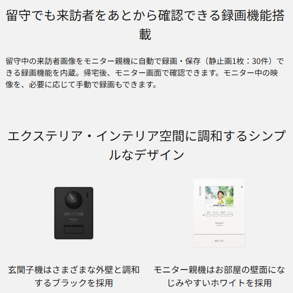トレンドのダークカラーを採用したカメラ玄関子機、お部屋の壁面になじむシンプルなデザインのモニター親機。