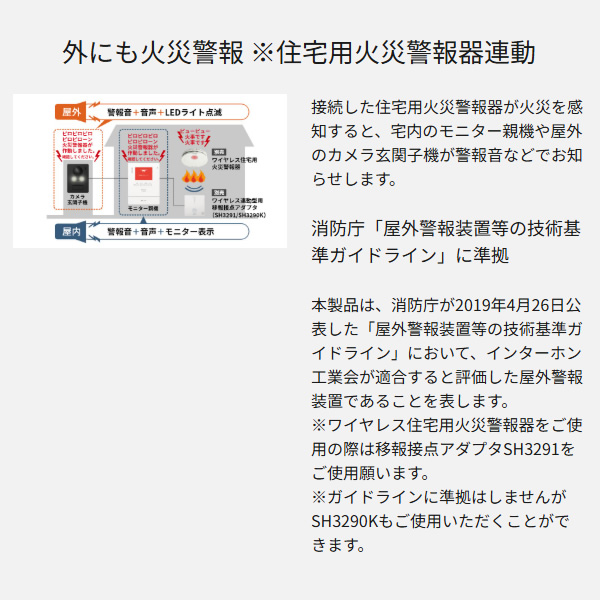 ●火災が発生した際に外にもお知らせする「外にも火災警報*」。*住宅用火災警報器連動