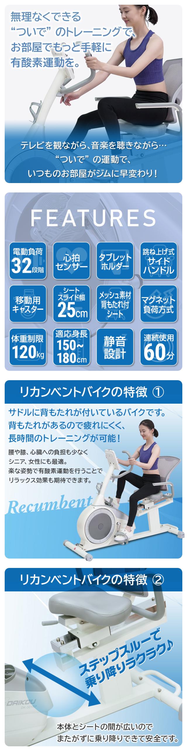 フィットネスバイク 静音 マグネット式負荷 電動32段階調整 家庭用 連続使用時間60分 リカンベントバイク 背もたれ付き 介護 リハビリ 健康増進 エアロ トレーニング プレゼント ギフト ダイコー DK-301RP